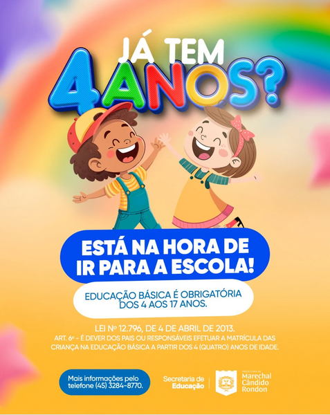As matrículas para a Educação Infantil 4, destinadas às crianças que completam 4 anos até 31 de março de 2026, ocorrerão de 6 a 12 de novembro, conforme o georreferenciamento, ou seja, na escola mais próxima da residência da família. A Secretaria de Educação reforça que a educação básica é obrigatória dos 4 aos 17 anos.