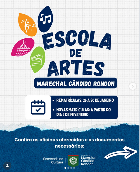 A Secretaria de Cultura de Marechal Cândido Rondon divulgou o cronograma de rematrículas e novas matrículas para as atividades da Escola de Artes. O período de rematrículas ocorre entre os dias 26 e 30 de janeiro, sendo destinado exclusivamente aos alunos que já participam do programa e que não desistiram das aulas em 2025.