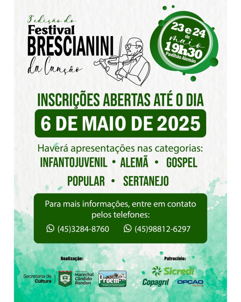 Os artistas interessados em participar do 3º Festival Brescianini da Canção têm até o dia 6 de maio para realizar suas inscrições. O evento musical, de participação popular, tem como objetivo valorizar os artistas locais e regionais, além de promover a difusão das músicas brasileira e alemã.